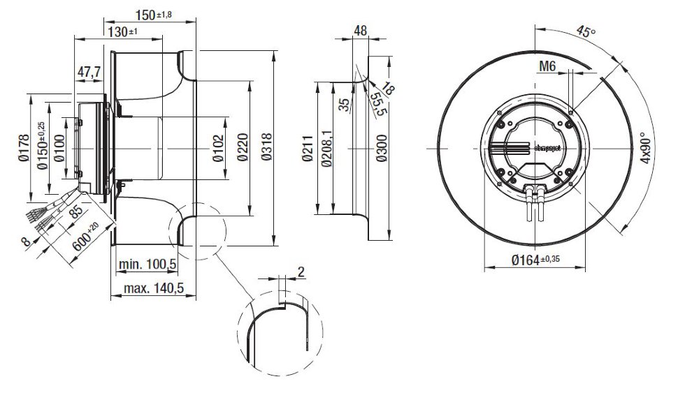 – Монтажное положение и отверстия для слива конденсата: без отверстий для слива конденсата – вал в горизонтальном положении или ротором вверх, на заказ изготавливаются вентиляторы с монтажным положением ротором вниз.