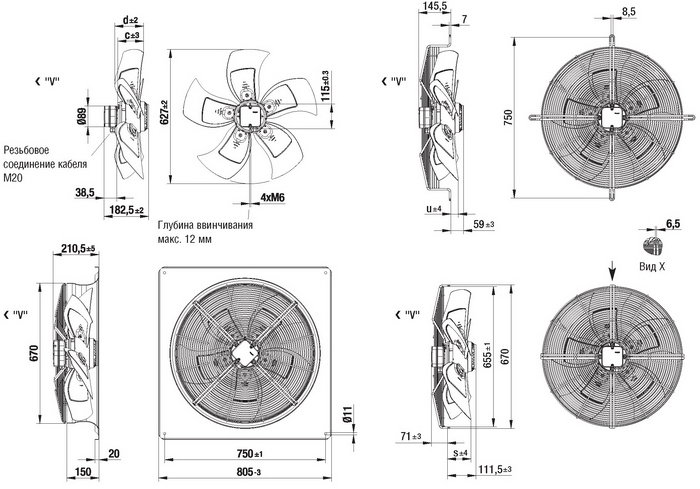 S – осевой вентилятор с защитной решеткой