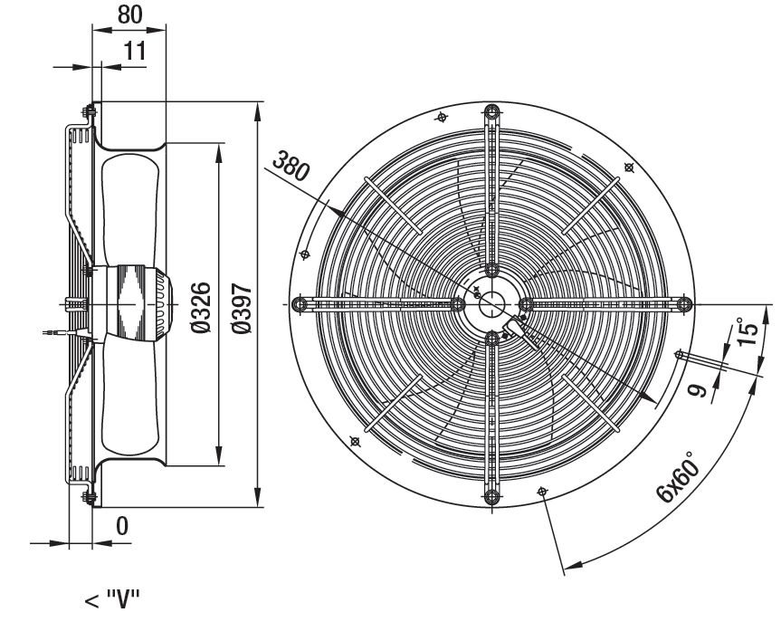 - Направление вращения: при направлении потока воздуха “V” – против часовой стрелки, при направлении “A” – по часовой стрелке, если смотреть на ротор